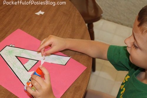 My son colored a large letter A with a green crayon and then I cut it out for him.