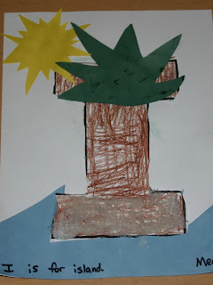 After our story the children made letter “I” islands. They first colored a capital letter I and cut it out. Then they glued waves, their “I” leaves and a sun to a piece of construction paper. The finishing touch was to put glue on the bottom of the “I” and then sprinkle sand on it. I got this idea from No Time For Flashcards.