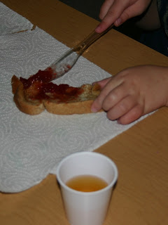 For a snack today the children drank juice and put jelly on a piece of toast. I was surprised at how difficult this seemed to be for some of the children. I think it was a good real world way to practice fine motor skills.