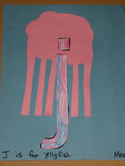 After our stories we made “j” jellyfish. The children colored and cut out a lower case letter “j”. Then they glued on a pink jellyfish I had pre-cut and glued the “j” on top. I got the idea from Totally Tots, but made some modifications.