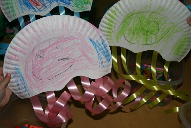 Later the children made jellyfish out of a paper plate and some curling ribbon. They colored the plate and then we taped lengths of ribbon to the back. They had fun with these. I got the idea from Ramblings of a Crazy Woman.