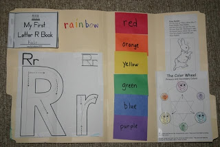 Also included in their folders was a copy of our Peter Rabbit song from Monday and a picture of Peter Rabbit to color from this site, their letter “R” tracing paper and mini book from First School, and the word “rainbow” that I wrote using the colors of the rainbow.