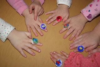 Orange juice carton pull tabs. I had been saving them ever since I saw an idea for using them at No Time For Flashcards. For our rings I gave the children some permanent markers (Brave, I know.) and let them color the tops. Then they each picked out a special rock that I hot glued to the top. The rings were a little big, but the kids all liked them.