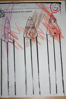 The rocket worksheet above is one that I have had for quite a few years. It combined three skills in one paper. I asked the children to write their names at the top and color the rockets. Then, they were to try to cut on the lines with scissors. Some did better than others at the cutting, but I praised each one for their efforts.