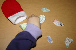 Later, I read the book again and the children used their animal cut-outs to act out the story. I gave each child a little mitten that a good friend of mine got at a thrift store. This was a fun activity.
