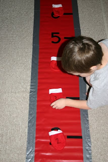 With more of the thrift store mittens I created a counting/number center activity. I labeled 10 mittens 1-10. The children took turns putting them in the correct order. A few of the children decided to match up the mittens with the numbers on our big number line on the floor. I thought this was a great idea.