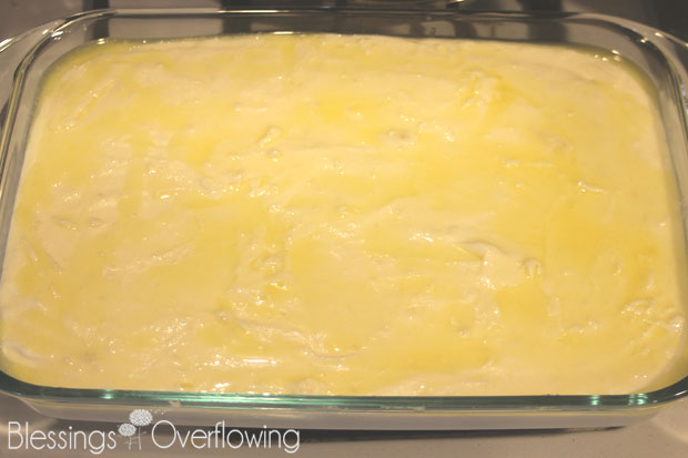 - Spread into a greased 9″ x 13″ baking dish.