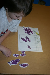 I printed an octopus size sorting learning activity from Confessions of a Homeschooler. The children really enjoyed this activity. I covered everything with contact paper for durability.