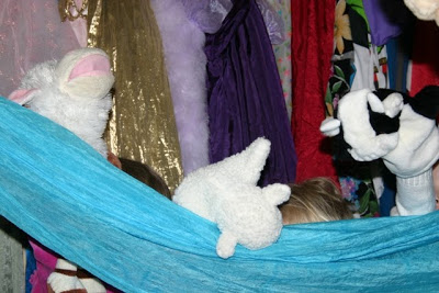 I also set out all of my puppets for the children to use during our free play time. They used a large play silk to make a curtain for the puppet shows they performed. A few years ago I made my own children a doorway puppet theater. Children seem to enjoy using puppets no matter what they hide behind. Fun!