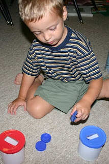 Then I decided to give him some red lids and a container with a red lid. I asked him to put the red caps into the red container and the blue caps into the blue container. He did this a few times before loosing interest. At 2 1/2 it seemed to be more fun just to put the bottle caps into the container than to actually sort them, but he did understand the concept.