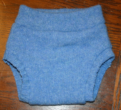 About a month ago I went to a Goodwill Outlet. It was really cool. I paid for my items by the pound. The more pounds you buy the cheaper the price. I didn’t buy much, but I figured I still got all of my items for around 50 cents each. I found 2 wool sweaters. One of them is pictured above. I felted the sweaters by washing them in a pillowcase with hot water, and then drying them on high heat in the dryer. This makes them very dense and allows them to be cut like regular fabric. I was able to make a pull on diaper cover and a pair of longies from the sweater above.