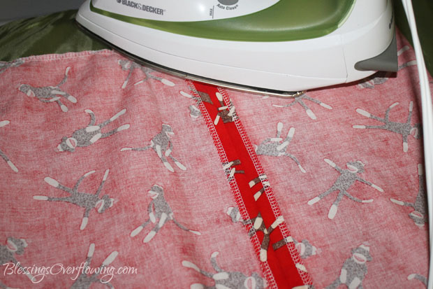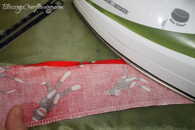 Step 11: Press down the unserged edge of the ruffle piece 1/2 inch, wrong sides together. Open the fold, place the raw edge on the fold line, and press again. Fold the fabric one more time so that the raw edge is totally enclosed inside the folded fabric. (See picture above)