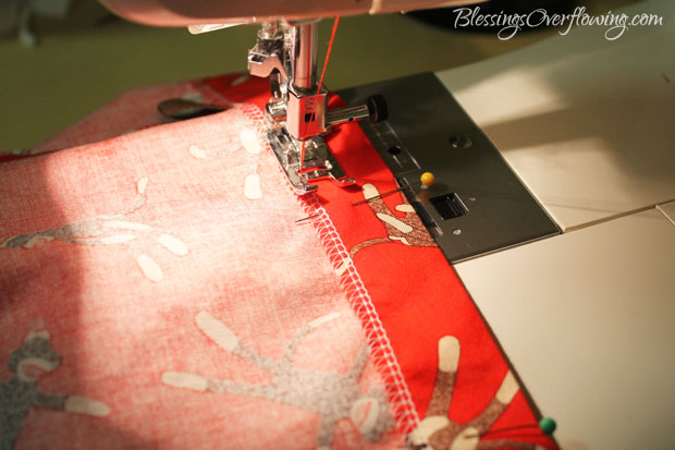 Step 2: Serge or overcast all 4 sides of the main skirt piece as well as the 2 short sides and 1 long side of the ruffle piece. This will keep the fabric from fraying.