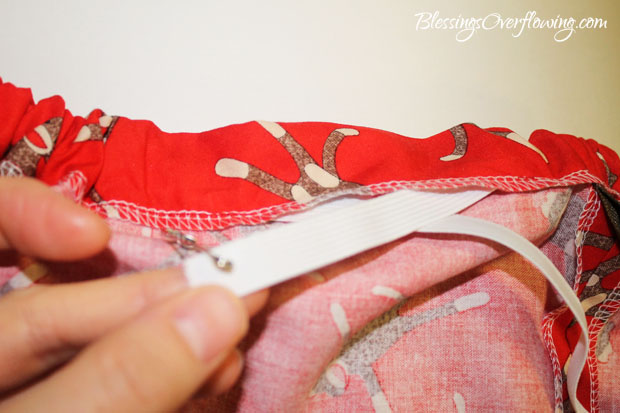 Step 7: Attach a safety pin to one end of the elastic and use it to thread the elastic through the casing. You should have two ends of the elastic coming out of the opening you left in Step 6.