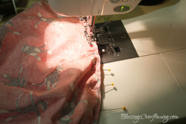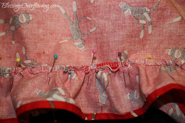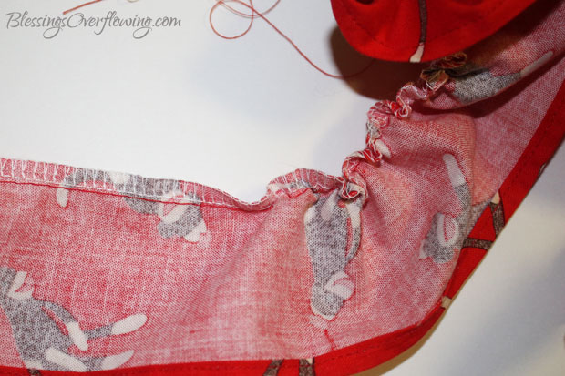 Note: The correct way to gather is to make 2 lines of stitching, but since 1 line of stitching worked fine for me, that is what I did. Don’t you just love how I can throw caution to the wind like that? I like to live on the wild side. 😉