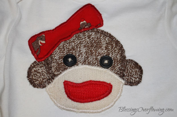 Here’s a close-up of the sock monkey. The face is made from a sock that you would use to make a sock monkey. So cute!