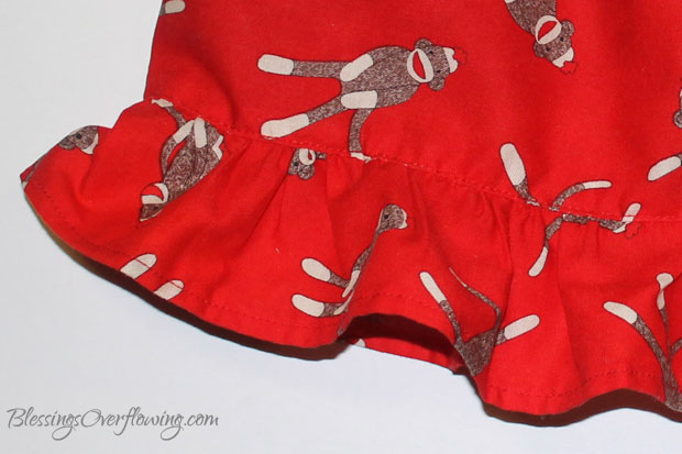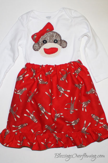 My niece turned one last week. When I asked my sister-in-law what I could make for my niece, I strongly hinted that I wanted to make her an outfit to wear for her birthday party. My sister-in-law kindly obliged my need to sew something fun and chose some cute sock monkey fabric.