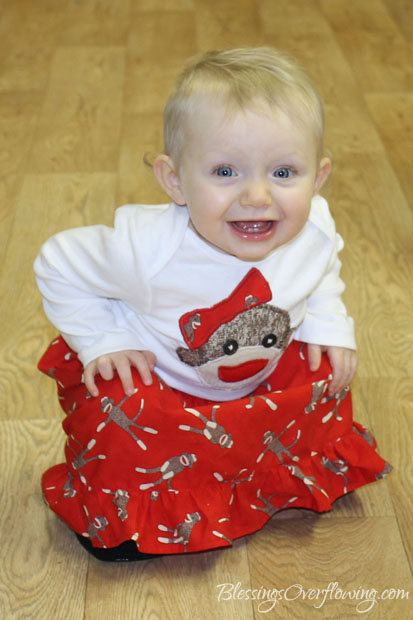 As you can tell I made her a shirt to go with her new skirt. I used the tutorial from Angela Yosten which was very detailed and easy to follow. When I printed out the pattern pieces from the tutorial I shrunk them down to fit the front of an 18 month shirt. Otherwise, the sock monkey would have been way too big, but would have been a good size for an older child.