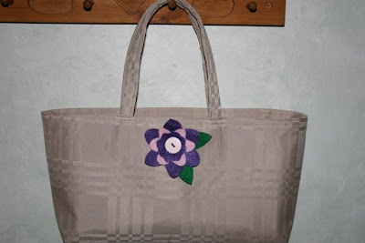 First, I made a bag using two placemats. I cut 2 1/2 inches off of one long side on each placemat and turned those pieces into the handles. (Sometime soon I hope to have a tutorial posted about how I make these bags.) The flower was made from felt with a button center. The pattern pieces for the flower can be downloaded from MMM Crafts. I made this bag with the idea that it could be a reusable gift bag.