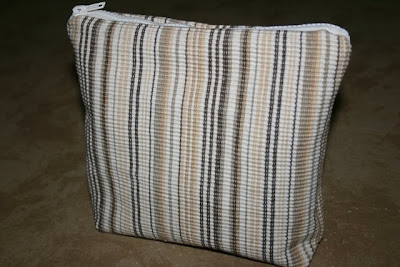 Next, I made a bag using one placemat and a zipper. The tutorial I found grabbed my attention because it said there were only four seams to sew. (I found the tutorial at this site.) The tutorial suggested using a 14 inch zipper, but I only had a 9 inch zipper. So, I had to cut off some of the placemat at the side. This made it more of a cosmetic bag size. If I make another one of these I will make sure I get a bigger zipper so that I don’t waste any of the placemat.