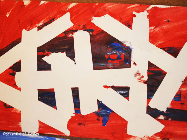 This was a fun and easy activity. I recommend painter’s tape over masking tape. We had made tape paintings another time and found it was harder to peal the masking tape off.