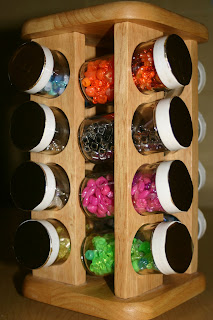 When my husband and I got married we received a spice rack. After a few years I had used most of the spices and found that I just didn’t have room for it in my kitchen anymore. So, I decided to wash all of the jars and store my beads and other miscellaneous little craft items in them.