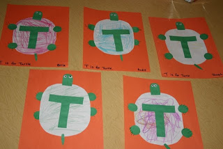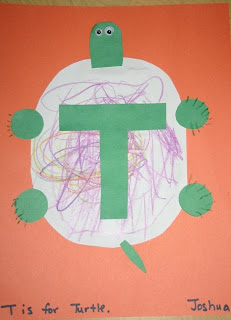 To make the turtles I first gave each child a white oval to color. Then they glued a pre-cut letter “T” onto it. After that they glued the oval to a piece of construction paper. This was the turtle’s shell. Then they glued 4 pre-cut circles to the shell to serve as feet as well as a tail and head. They finished their turtles by adding wiggly eyes and claws drawn with crayons.