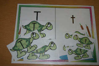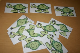 I had two turtle themed center activities today. The first was numbered turtles from Confessions of a Homeschooler. She suggested clipping the correct number of jumbo paper clips to each turtle. I just had the children put the turtles in order today, but am going to set out some beans later this week and see if they can put the correct number on each turtle.