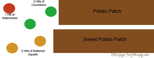 Here is a map of what I planted in the small garden plot. I know there are 12 sweet potato plants, but I lost track of how many regular potatoes I planted. I know there were more than 24, at least I think there were.