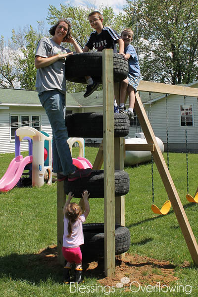 This year my husband wanted to build something the kids could climb on. He had come up with an idea that used tires but he wasn’t having much luck finding some.