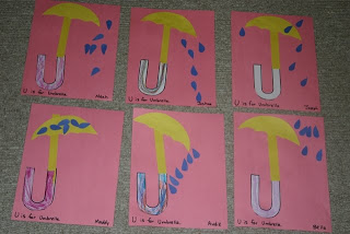 To make the umbrellas the children first colored a letter “U” from Itty Bitty Bookworms (printed at 40%). Then I cut them out and they glued them to a piece of paper. They also added a pre-cut yellow rectangle and an umbrella top. To finish their pictures they glued on 6 blue raindrops that I had pre-cut. This added a counting element to our letter activity.