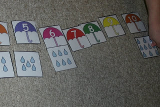 One of our center activities today incorporated two skills. First, I asked the children to sort the umbrella cards in numerical order. (They worked in pairs for this activity.) Then I asked them to put the correct raindrop card under each number. I found these umbrella number cards at Home Grown Hearts. They were originally designed to be a flip book, but I liked this application a little better.