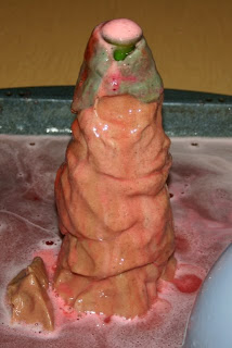 After our story the children helped me make our own volcano. They took turns putting play dough around a glass pop bottle. Then they each got to put an ingredient into the bottle. The last ingredient was vinegar and then it exploded. They loved it so much we did it a second time. I am glad we had a pan underneath because it was a little messy. But, messy is usually fun, right?