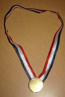 We ended our morning with a medals ceremony. To make the medals I hot glued a piece of red, white and blue ribbon to the back of a juice bottle lid. Then I added a large gold sticker to the front. This idea was based on one from Silly Eagle Books; however, I didn’t have any gold glitter. So, I went with materials I had on hand.