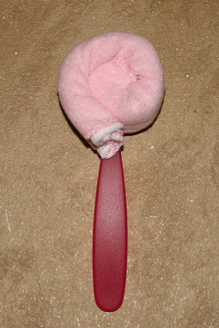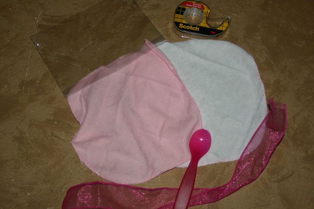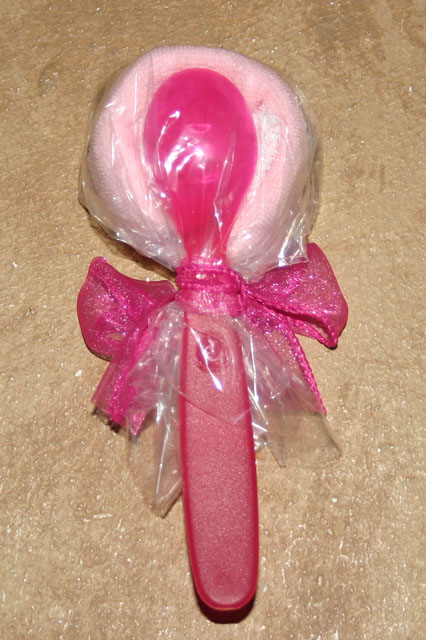 Step 4: Put the cellophane bag* around the spoon and washcloth and then tie it shut with the ribbon.