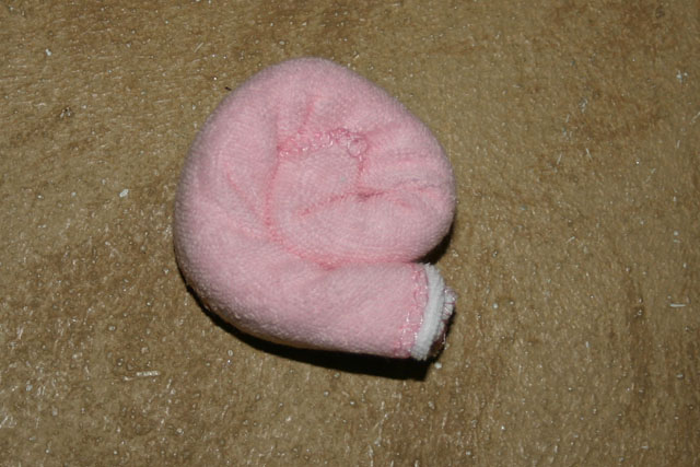 Step 3: Roll up the washcloths again only this time make them into a circle or tight ball. They will kind of look like a snail’s shell. Use a straight pin (or tape) to keep the washcloths from unrolling.