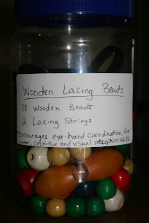 I went to a yard sale recently and bought a bag of wooden beads for 25 cents. I knew I had an unused set of 3 foot shoelaces at home that would be perfect for stringing the beads. An empty peanut butter jar became a storage container for the beads. So, for almost nothing I had a 78 bead lacing activity for my children. My, I was having a frugal day! 🙂