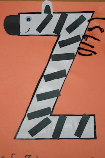 To make the zebras each child cut out a letter “Z” that I had printed from Itty Bitty Bookworms. Next, they glued their “Z’s” to a piece of construction paper. They added black stripes I had pre-cut from construction paper, a wiggly eye, an ear, a nose, and a mane (pieces of yarn). I think they turned out really cute.